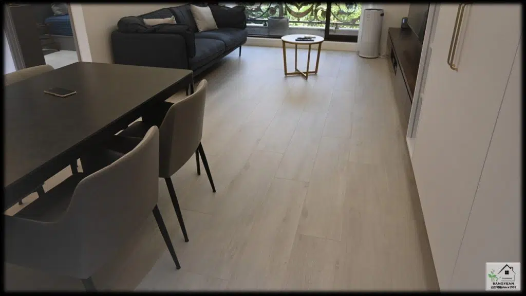 客人認為因為潮濕所以應該要用spc石塑地板,但是小編告知業主,就是因為潮濕才不該鋪石塑,因為其材質不透氣,拋光磚會被悶住,長期受潮情況下,可能會讓拋光磚捧共機會大增,就是因為水氣重,才需要鋪設超耐磨木地板,其為高密度纖維板,會吸收濕氣,除溼開下去,濕氣才會散去。事實證明這確實是正確選擇。
