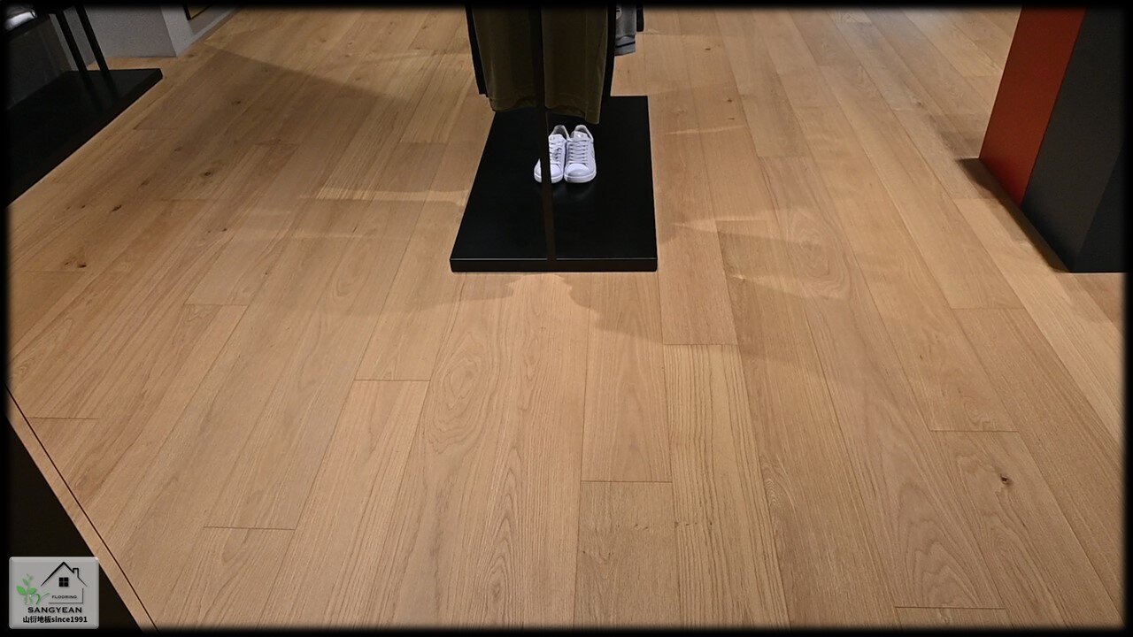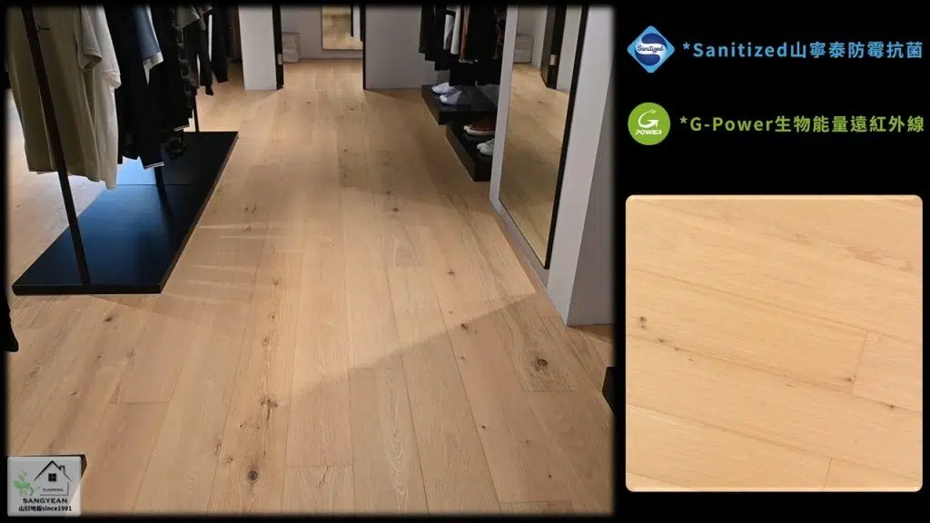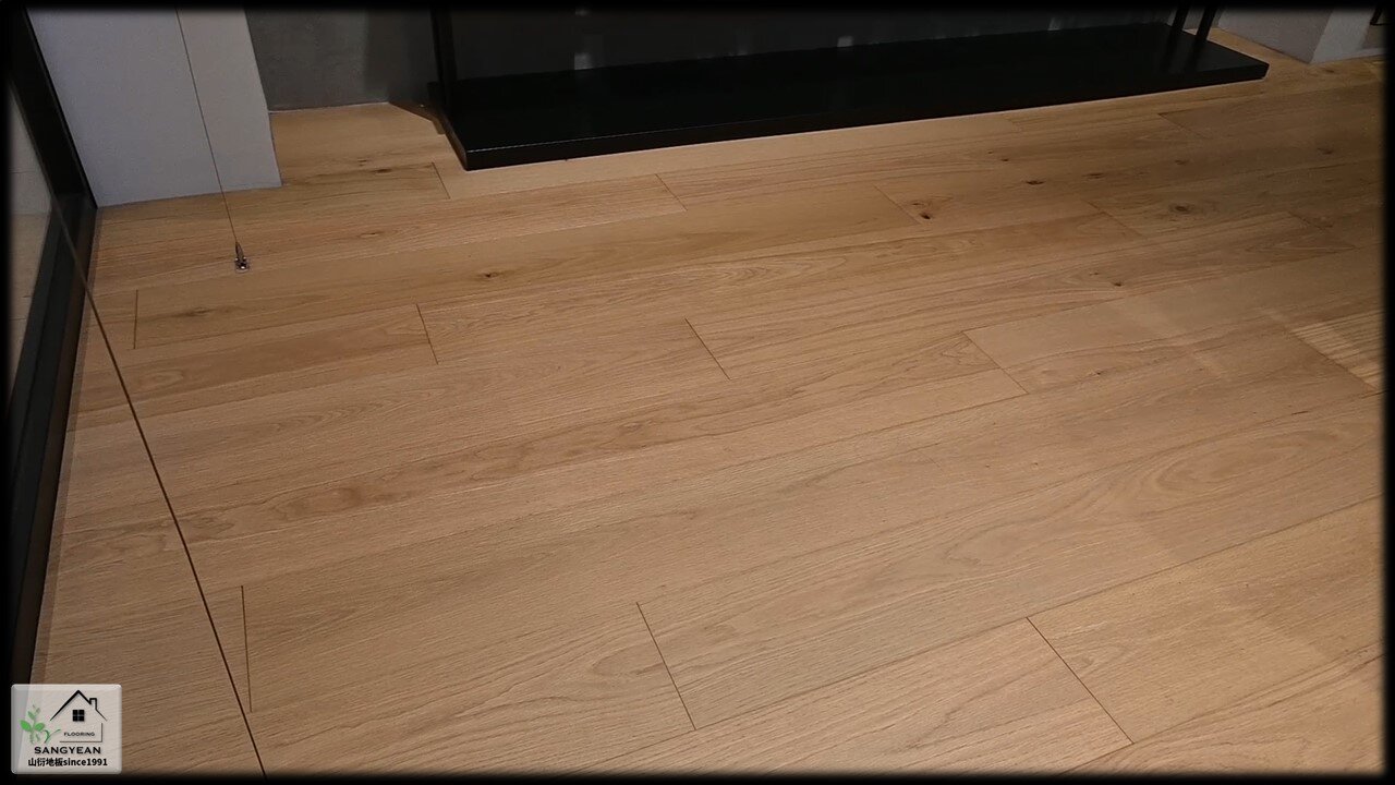 施工採用平鋪施工,最底下會鋪一層12mm落葉松夾板,其甲醛釋放量為F1,地板完成面會落在約2.4公分。