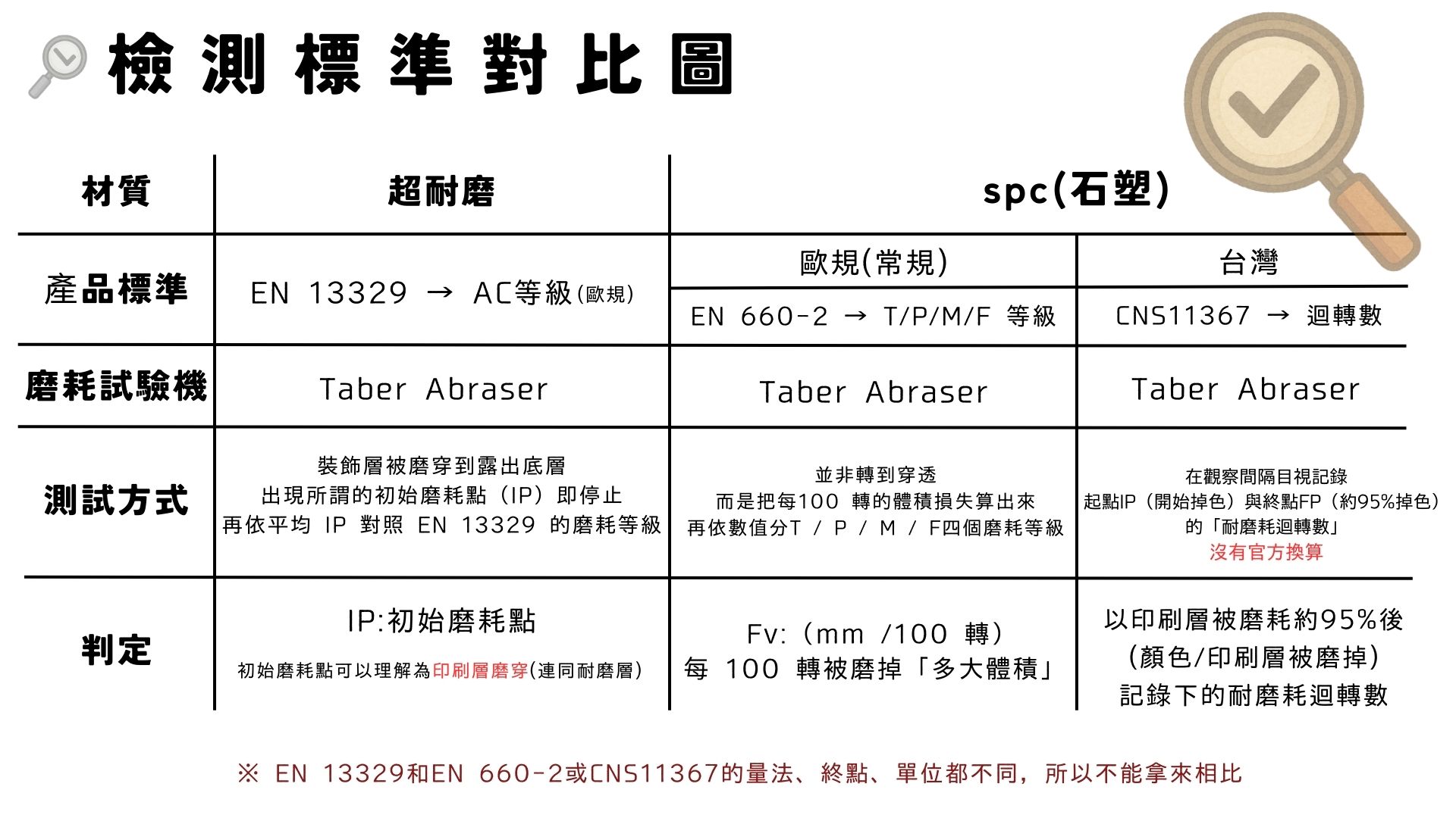 EN 660-2(SPC/彈性地材)看的是體積磨耗 Fv(mm³/100 轉),不需要磨穿,而是計算每 100 轉被磨掉的體積,並據此分 T / P / M / F 等級。(台灣商品幾乎不會標示此等級)