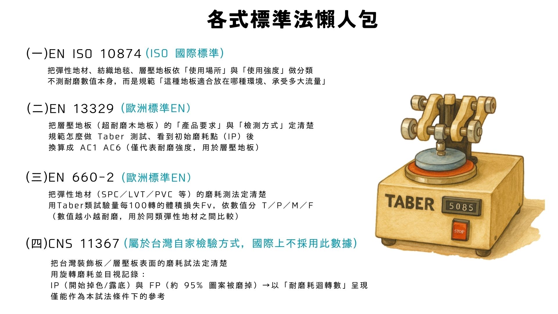 它不測耐磨數值本身,而是規範「這種地板適合放在哪種環境、承受多大流量」。