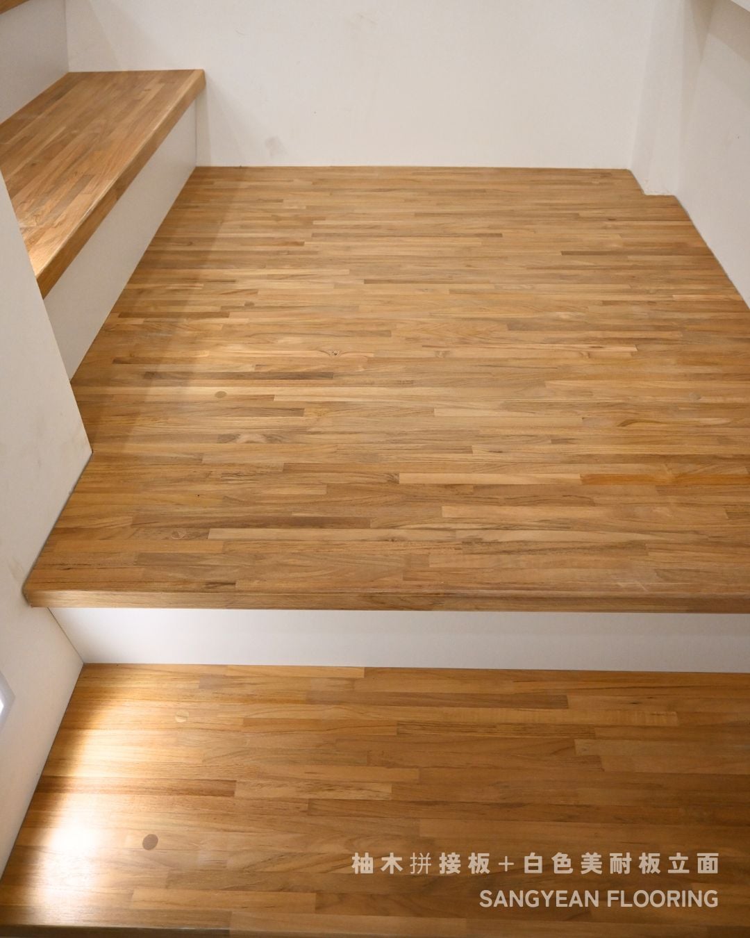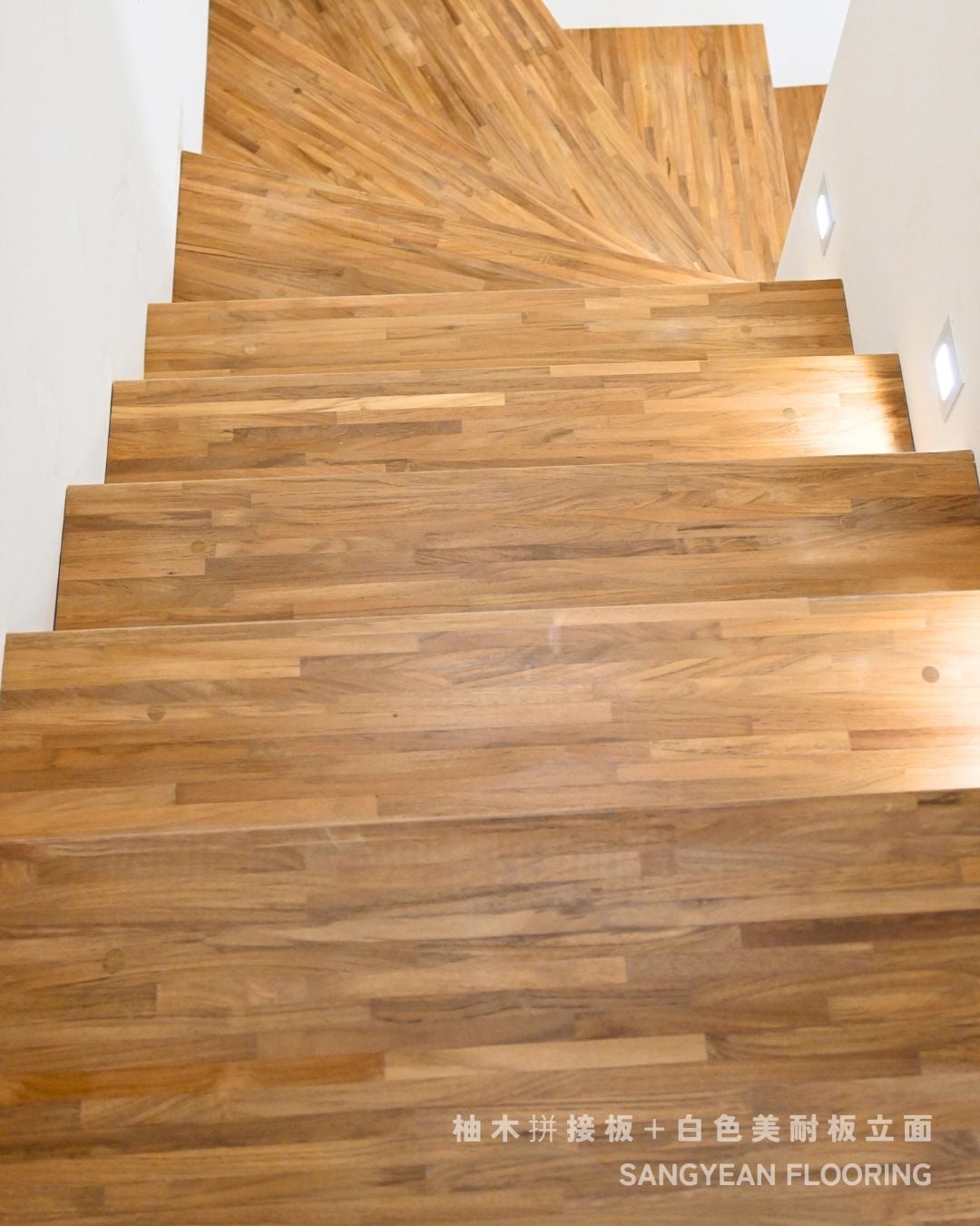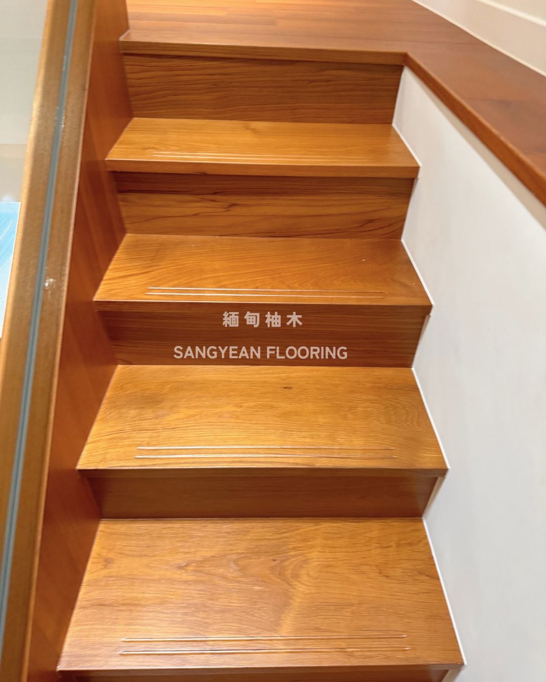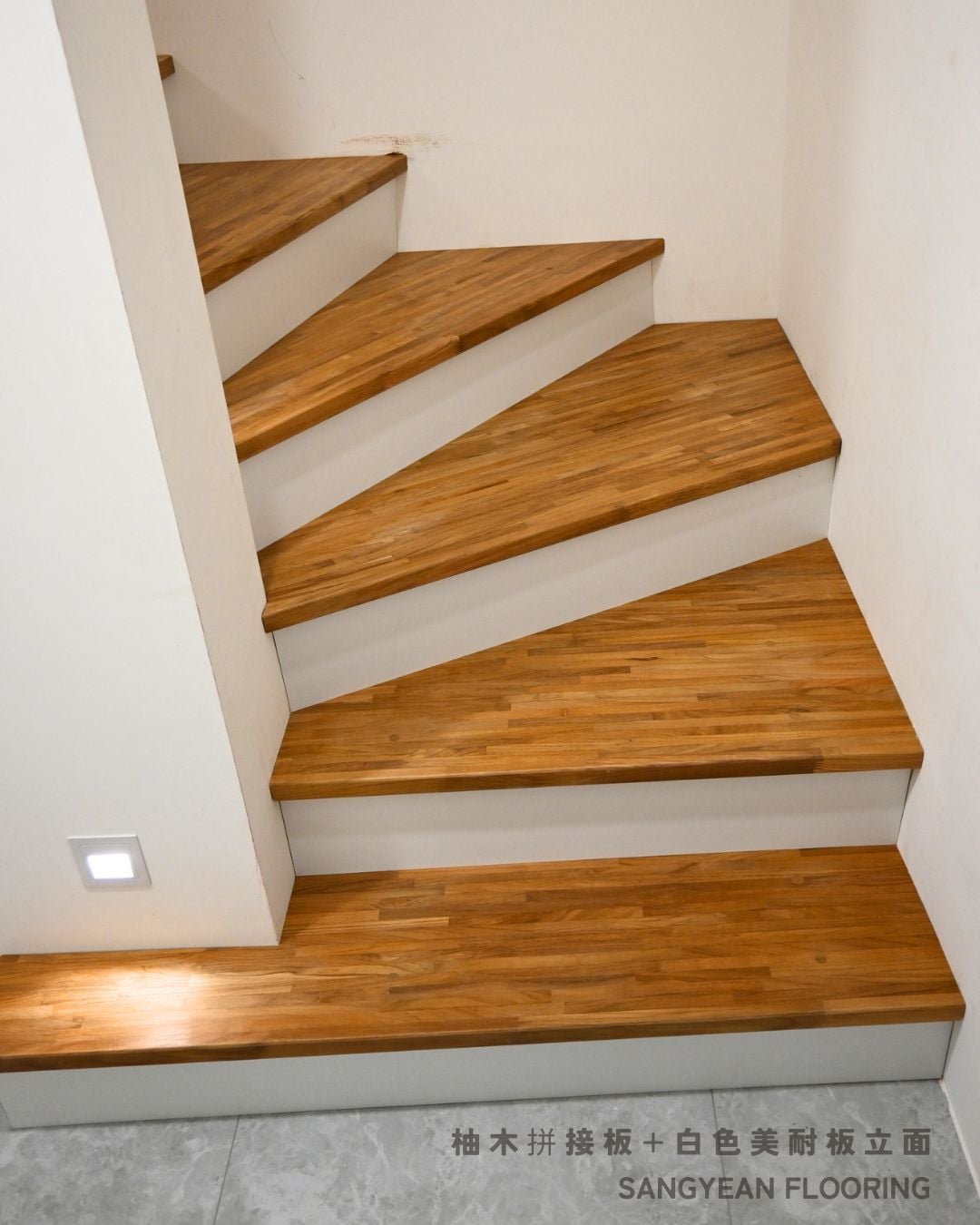 實木樓梯踏板|溫潤步伐與安全止滑樓梯 / 作者: sangyean / 樓梯踏板 / 2025 年 10 月 21 日 在室內設計中,樓梯不僅是連結樓層的動線,更占據顯著的視覺份量,等同於裝潢與家具的一部分;選擇實木樓梯踏板,能同時提升質感與安全。 實木樓梯踏板的優點: 選擇實木樓梯踏板,能讓動線維持乾淨俐落的比例,營造沉穩而不厚重的視覺。實木(如緬甸/印尼柚木、條併栓木、南美柚木、拼接材)具良好彈性與穩定度,腳感回彈讓長輩與孩童日常上下樓更輕鬆。 厚度約30mm、,耐磨易清潔,同時維持自然木紋細節。 另可搭配立面施工(木地板或美耐板等異材質) 栓木條併實木樓梯踏板-淺色木 栓木淺色木,紋理筆直、山形紋清晰,色澤由淡米色至淺褐色,整體視覺明亮、耐看。材質硬度與韌性兼具,具良好彈性與抗震性, 緬甸柚木實木踏板 緬甸柚木以金棕至深棕色與細緻油性色帶聞名,穩定性與耐候性極佳,含油量高、抗潮抗形變,行走腳感溫潤且具微彈性。紋理直且優雅,久用色澤更沉穩 拼接實木踏板 材質:柚木與橡木,栓木 南美柚木踏板安裝範例 南美柚木色澤通常較緬甸柚木更淺,從淡稻麥色、蜂蜜金到淺金棕,日照後會慢慢轉為暖焦糖色;木紋以直紋為主、油線較柔和,整體給人明亮、清爽、年輕感。偶爾會有黑線條 讓每天的上上下下,成為被木紋妥帖接住的節奏。選對實木樓梯踏板其止滑、木紋觸感等細節,家就同時擁有美感與安全 line:@sangyean